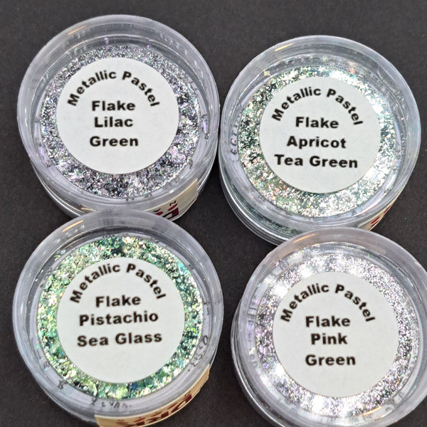 Metallic Pastel Flake Pistachio/Sea Glass #0874 (0.15g)Metallic Pastel Flake Apricot/Tea Green #0873 (0.15g)Metallic Pastel Flake Lilac/Green #0875 (0.20g)Metallic Pastel Flake Pink/Green #0871 (0.2g)